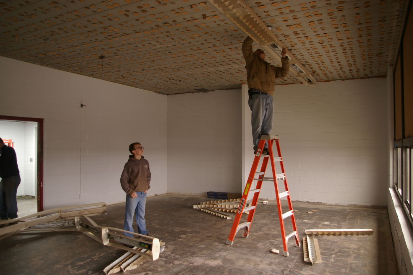 One big job that is on the list is replacing the ceiling tiles. Along with that, we are replacing the lighting in every room, partially because it is very old, most likely original to the building, and that means it is very inefficient. We also are lowering the ceiling a bit, so the existing lights won’t work. We have LED panels installed in all the areas that we are using right away, as well as the south hallway.